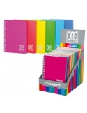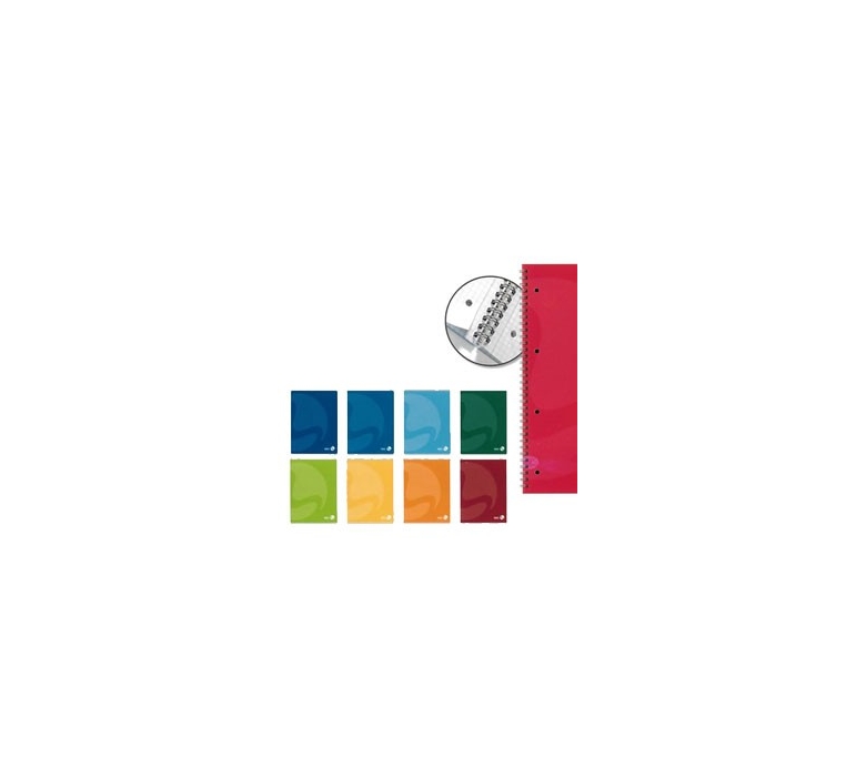 QUADERNO SPIRATALO SUL LATO LUNGO . 2 COPERTINE DA 300GR STAMPATA FRONTE-RETRO ASSORTITE IN 8 COLORI. COPERTINA CON PLASTIFICAZIONE OPACA E VERNICIATURA SERIGRAFICA LUCIDA. 4 FORI E MICROPERFORATURA. CARTA BIANCA IN PURA CELLULOSA DA 90GR.