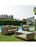 SET CON CUSCINI FORMATO DA 2 POLTRONE (H80XP69XL81CM), 1 DIVANO (H80XP69XL205CM), 1 TAVOLO RETTANGOLARE (H42XP60XL120CM) CON TOP IN VETRO BASE IN WICKER E PORTARIVISTE.